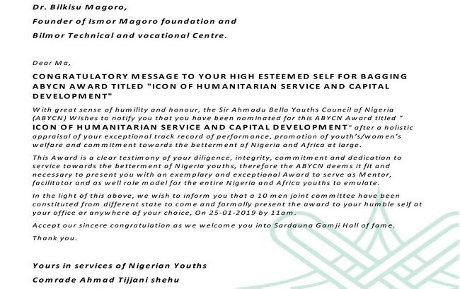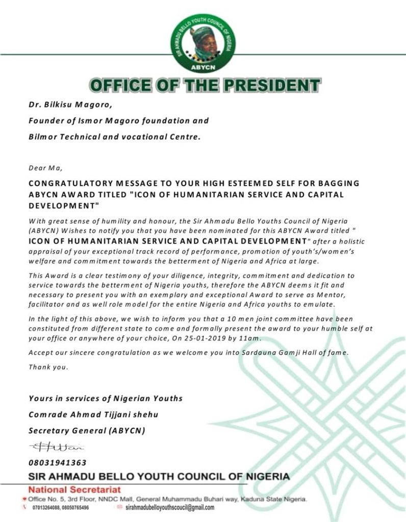 has been confirmed with an AWARD OF EXCELLENCE IN HUMANITARIAN SERVICE in the FCT