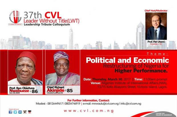 The Centre for Values in Leadership specially invites you to the 37th CVL Leader Without Title Leadership Tribute Colloquium in honour of Prof Ben Nwabueze @ 86 and Chief Richard Akinjide @ 85. Both honourees made their contributions in the Nigerian Legal profession.
